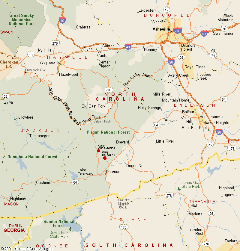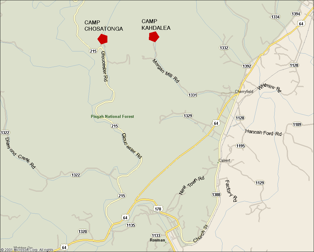 CAMP CHOSATONGA: From Hwy 64 go about 7 miles west of Brevard, Hwy 215 begins, turn north on 215. Go about three and a half miles. Camp is located on the right, marked with a large Camp Chosatonga sign and a pair of stone gate columns.